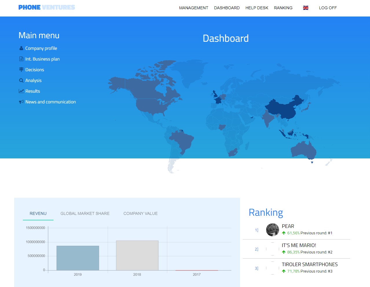 In de internationale bedrijfssimulatie PhoneVentures leiden de deelnemers hun eigen mondiaal opererende smartphonebedrijf. Binnen deze game ligt de focus op internationale marktuitbreiding van de onderneming. Elke speelronde staat voor een bedrijfsjaar waarin het managementteam interne en externe analyses uitvoert, een internationaal strategisch businessplan maakt en tactische en operationele beslissingen neemt voor alle afdelingen en landen die ze willen betreden.